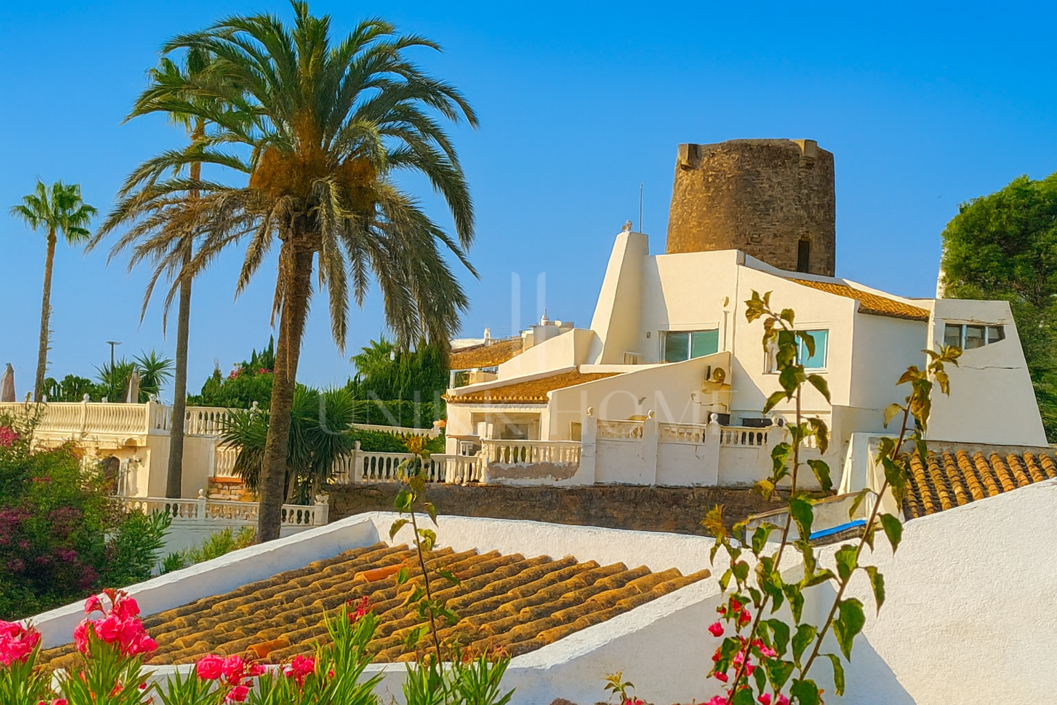 Set in the picturesque frontline beach community of Bahia Dorada, just a few minutes west of Estepona, this extraordinary home offers the rare privilege of walking straight from your garden onto the Mediterranean shore. Recently renovated while preserving its original 1970s character, the villa blends authentic charm with modern living comfort.