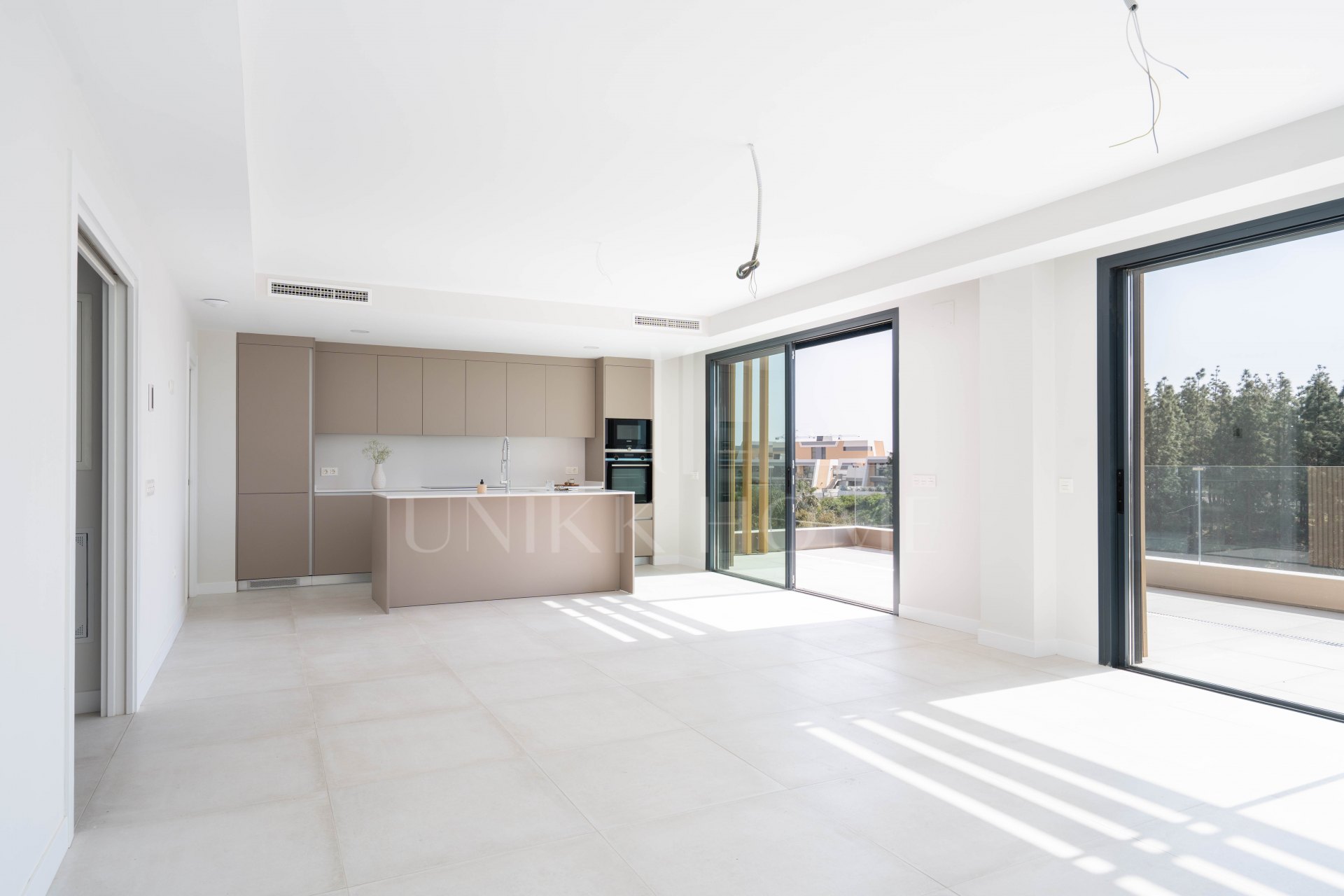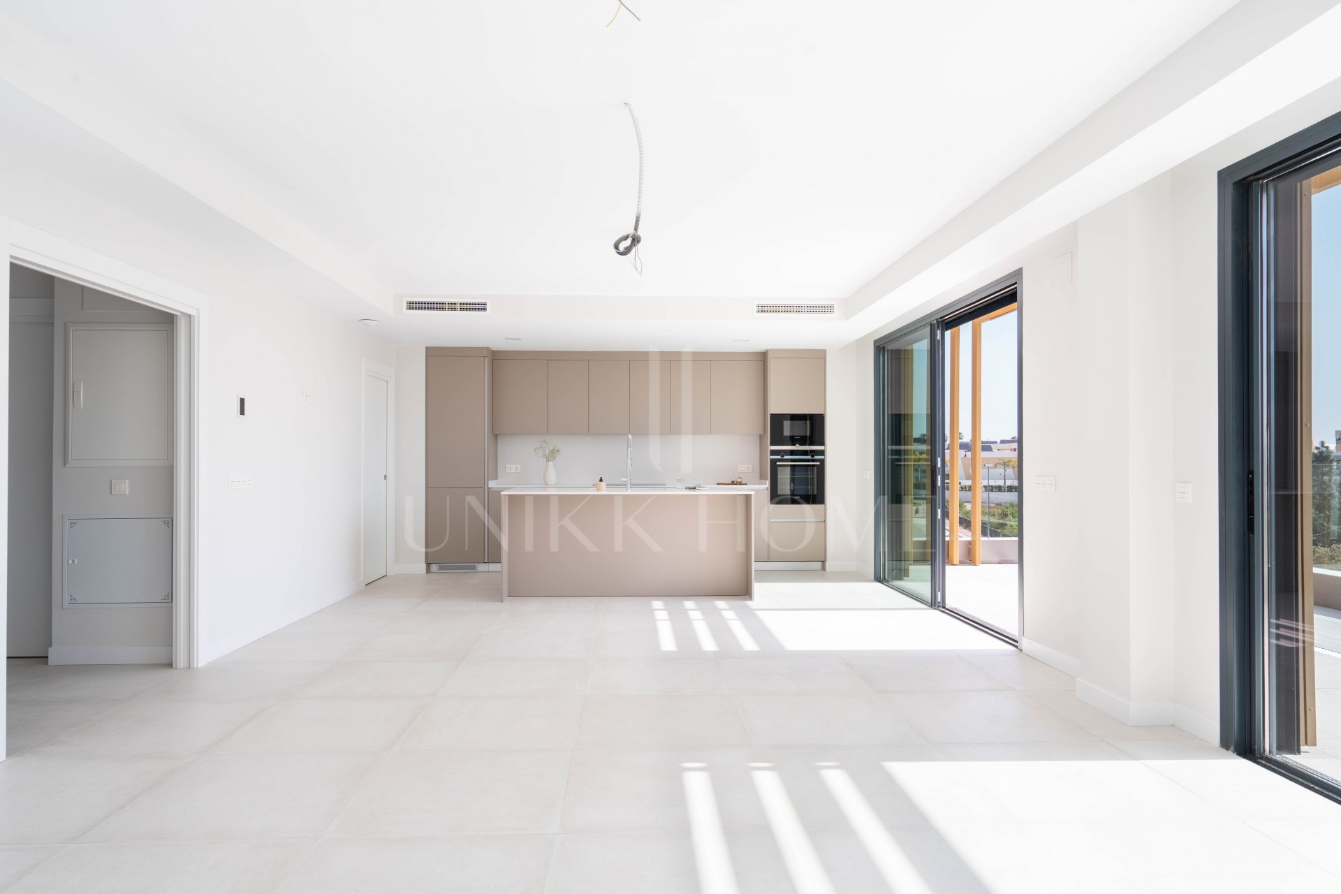 This home has been designed to balance style with comfort. The open-plan communal areas and generous interiors are crafted to flood the space with natural light, providing an incredibly inviting living experience. The expansive living room features large picture windows and high-quality porcelain floor tiles, creating an effortlessly bright and airy environment that maximizes daylight throughout the day. The spacious terrace offers panoramic sea views—an ideal setting to unwind and witness breathtaking sunsets. The kitchen flows seamlessly into the living area, contributing to the open, fresh ambiance that’s perfect for relaxed, everyday living. Top-tier finishes, including quartz countertops, integrated appliances, and ambient LED lighting, further elevate the space, adding sophistication and warmth. In the bathrooms, large-format porcelain tiles exude elegance, underscoring the attention to detail and commitment to quality design.