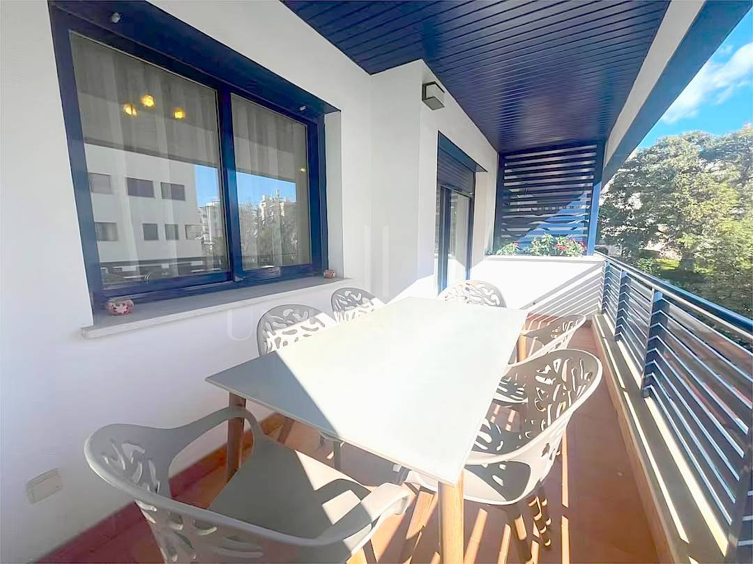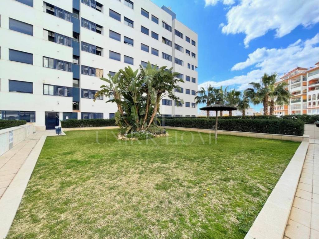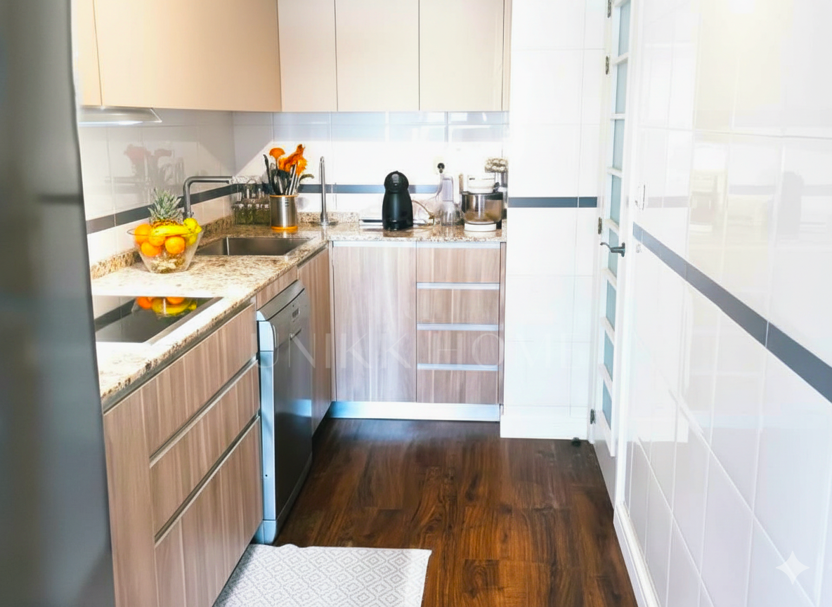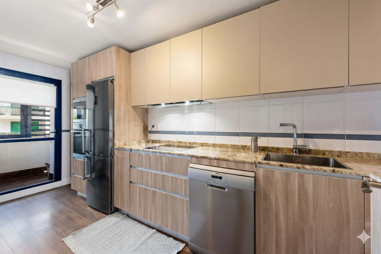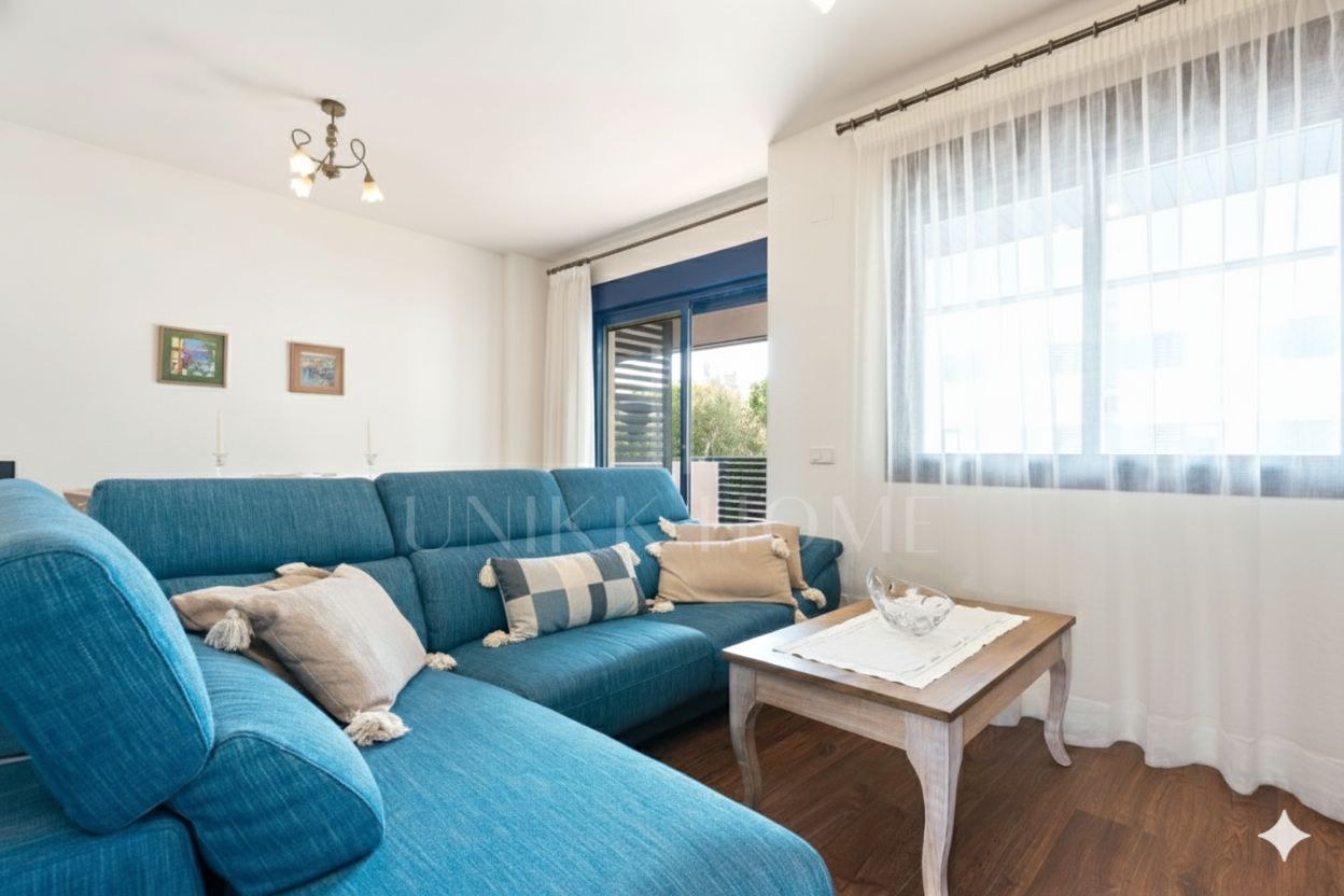 The property features a spacious main living room with wood-effect laminate flooring, providing warmth and comfort to the space. From here, there is access to a large private, covered terrace, ideal for enjoying views of the garden and the communal pool. Additionally, there is the option to enclose it with glass curtains, allowing you to make the most of this space comfortably throughout the year. The kitchen is fully equipped and furnished with elegant beige cabinetry, and includes a cozy breakfast area and an adjoining utility room for added functionality.
