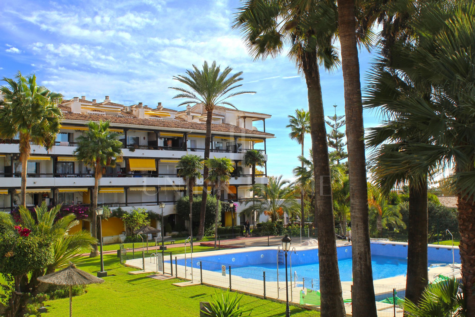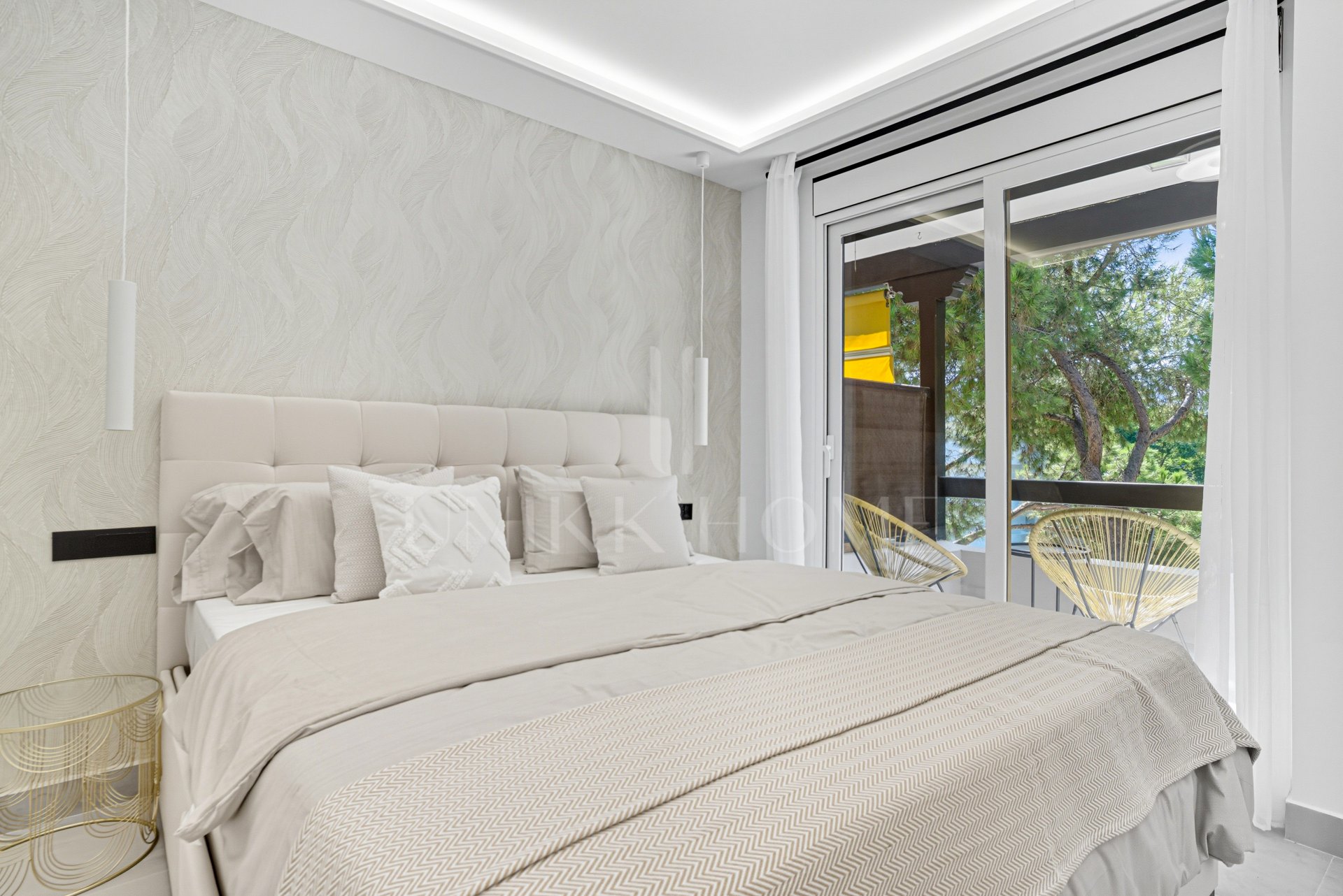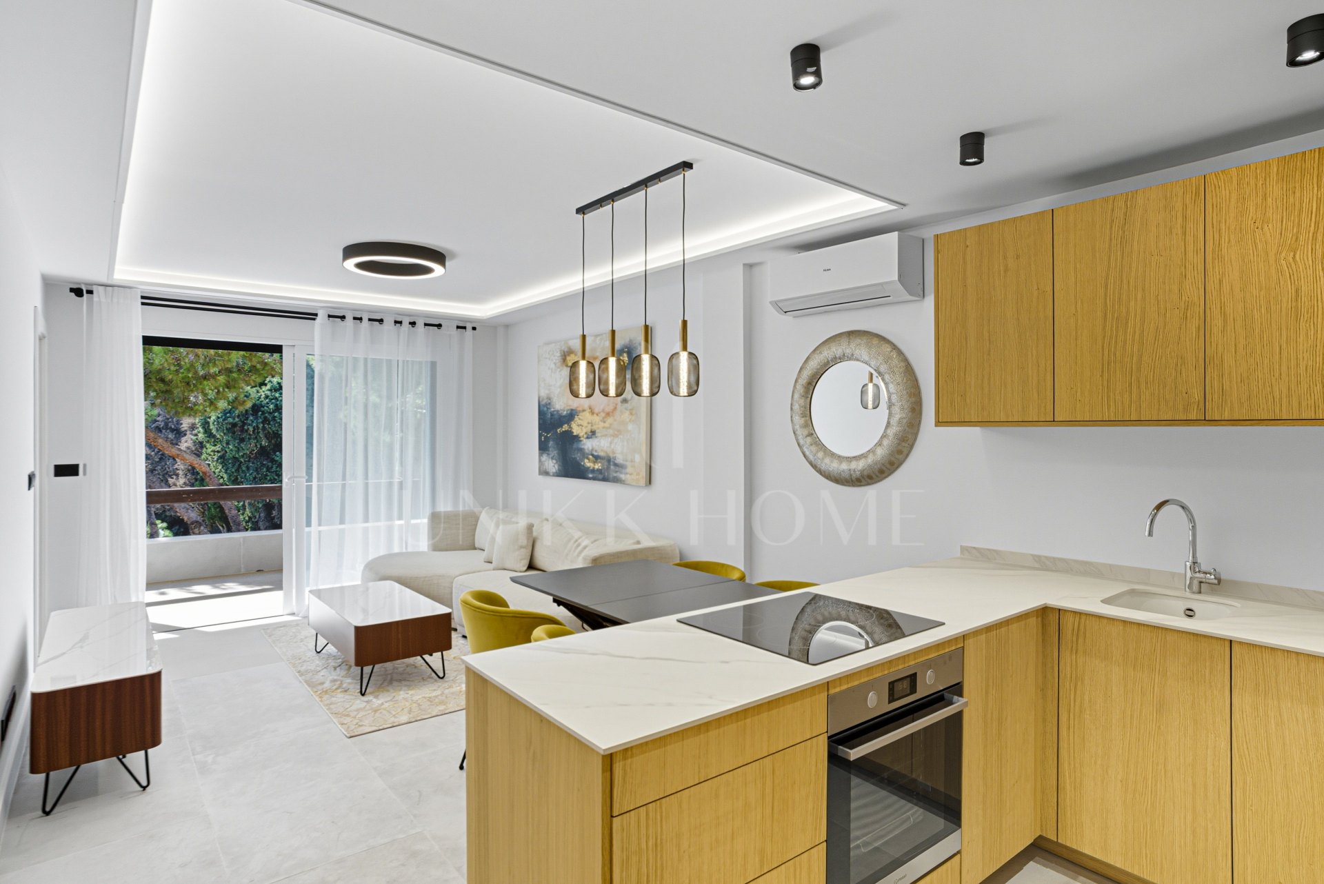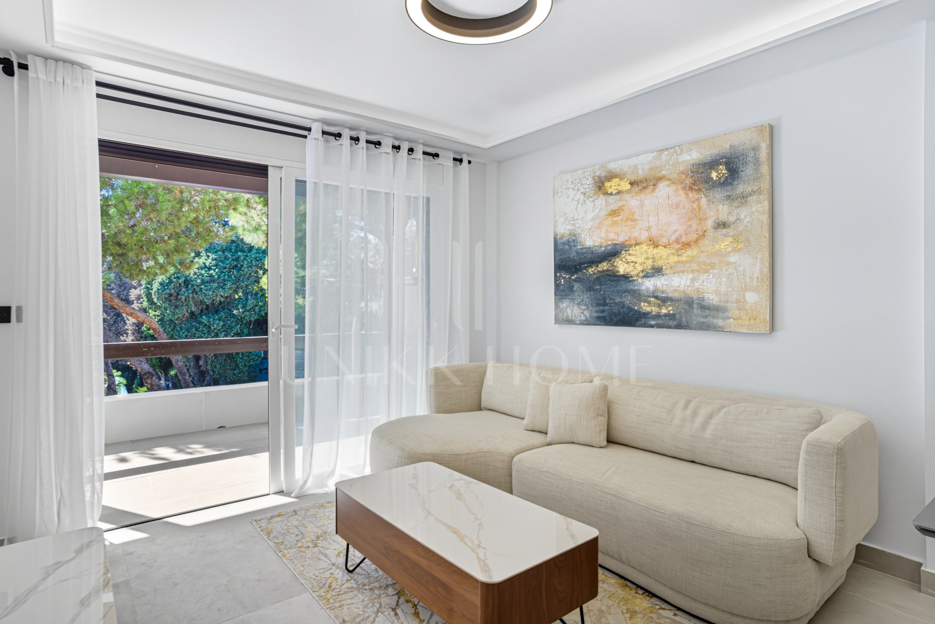 This exceptional three-bedroom apartment is situated in a highly sought-after location on Marbella’s prestigious Golden Mile, within the charming urbanization of La Carolina Park. The community offers extensive landscaped gardens, two swimming pools, and a tennis court, while also being within easy walking distance to the beach, renowned restaurants, and all essential amenities. Recently renovated to a high standard, the apartment is west-facing and features a spacious open-plan kitchen and living area with modern fittings and air conditioning, seamlessly connecting to a private terrace perfect for outdoor dining or enjoying the afternoon sun. The master bedroom boasts an en-suite bathroom, complemented by two additional well-sized bedrooms and a second bathroom. In addition, the property includes a parking space for one car in the communal garage, making it perfectly suited for comfortable year-round living in one of Marbella’s most desirable areas.