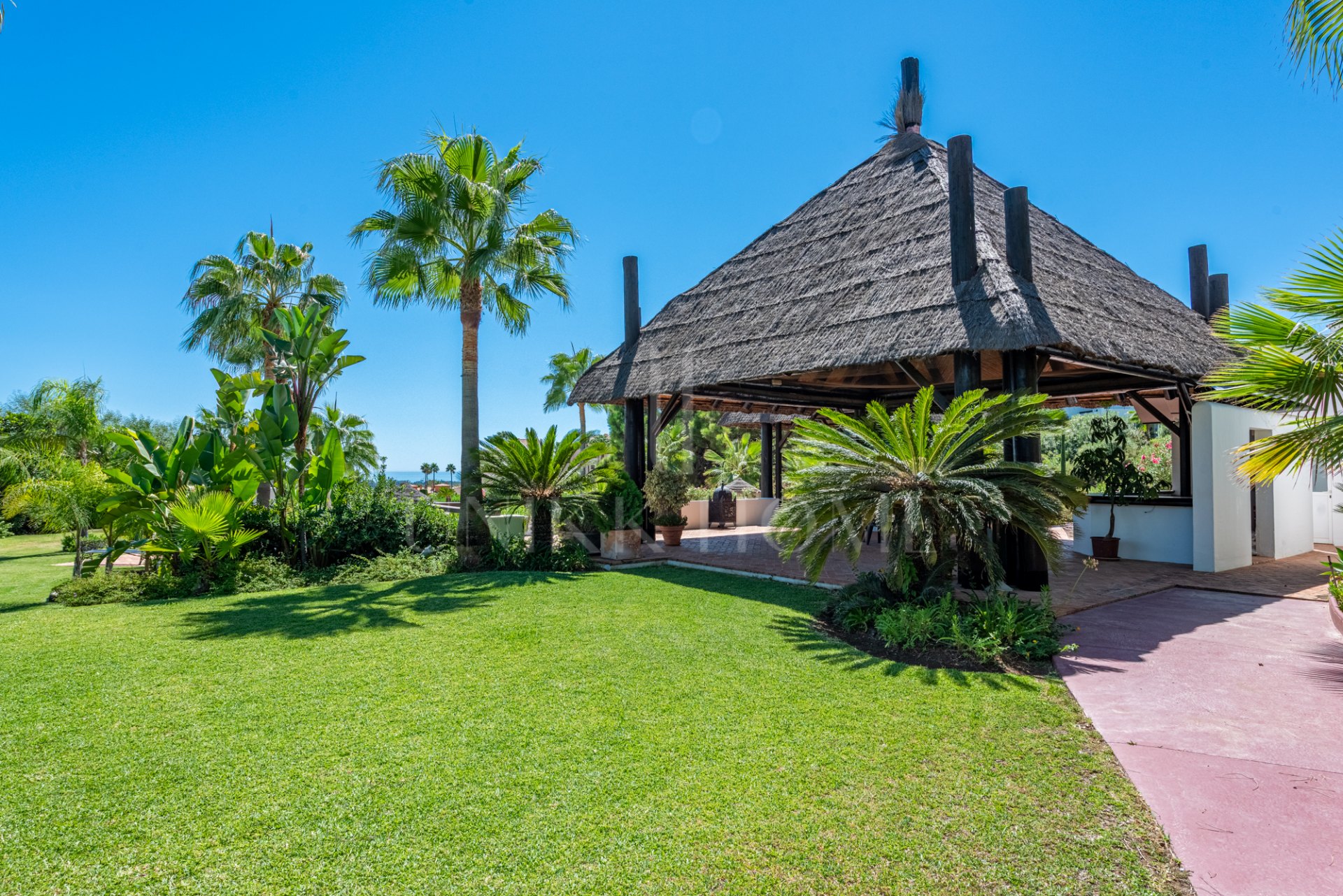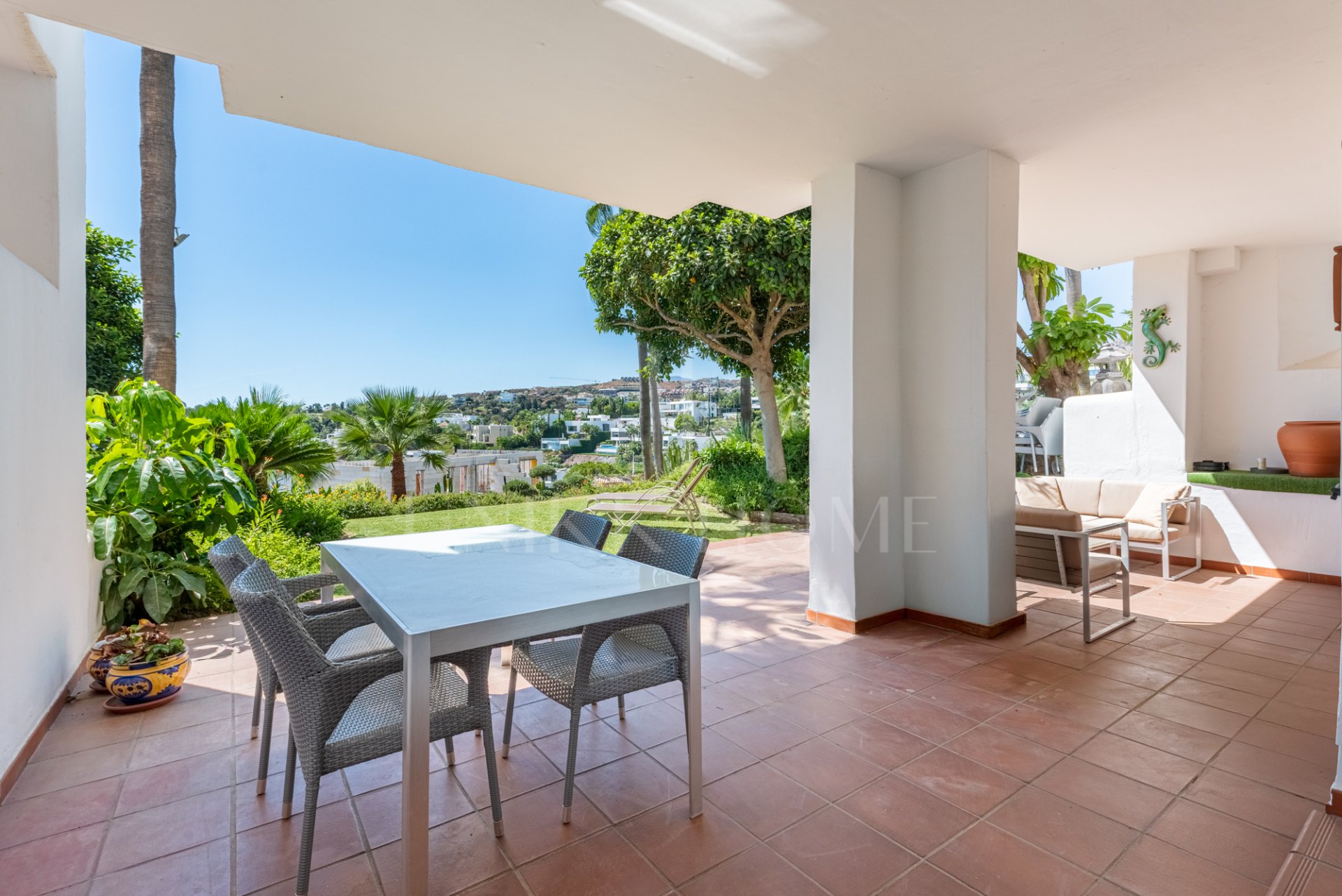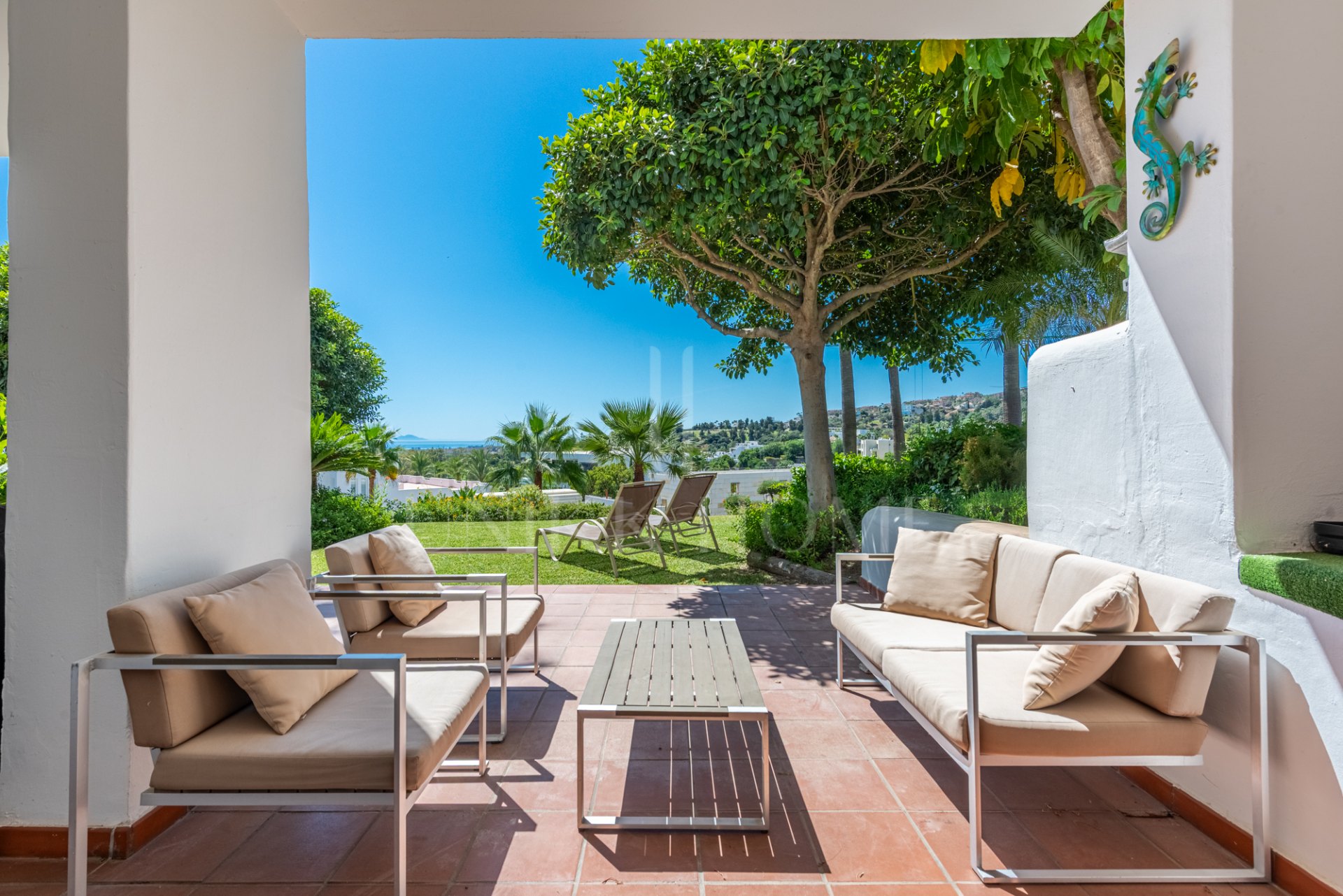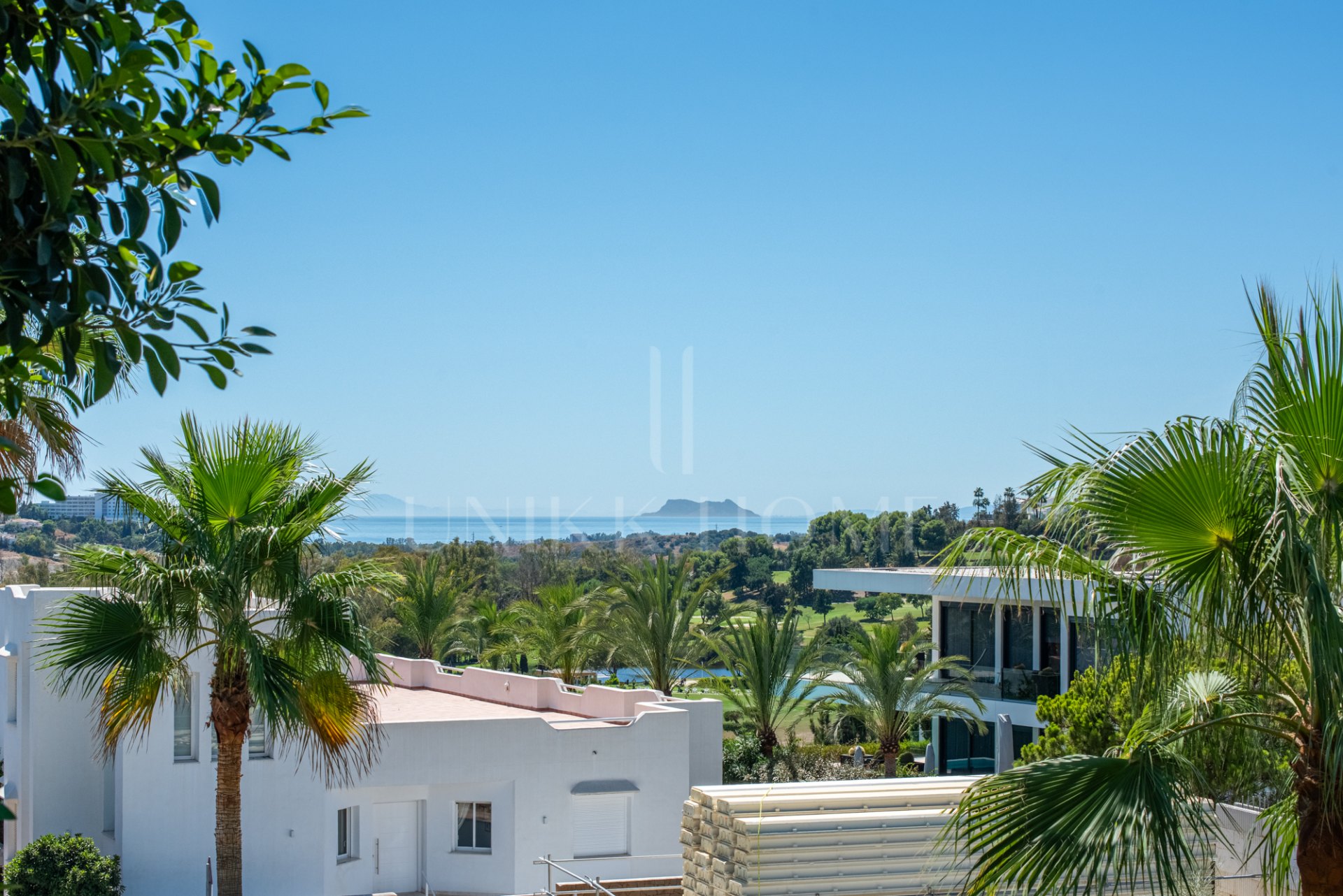 The property boasts a generous 42 m² terrace, partly covered for year-round use, and a private garden of around 50 m², creating an inviting space for outdoor dining, sunbathing, or simply relaxing while taking in the stunning views. Facing southwest, the terrace and garden enjoy long afternoon sun and sweeping vistas over the coast, stretching all the way to Gibraltar and the mountains of Africa.