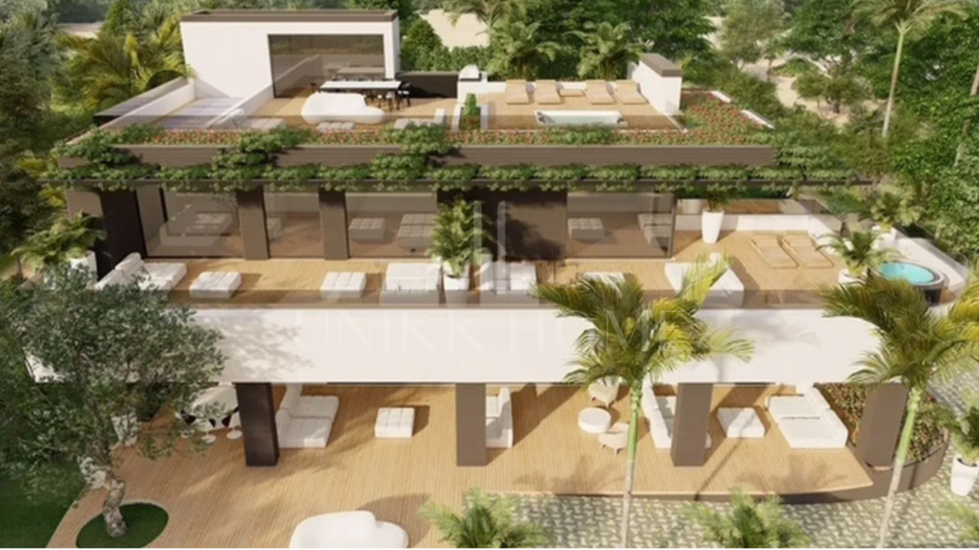 La planta principal puede albergar un salón-comedor de 100 m², cocina de 30 m² y un dormitorio de 35 m². En la primera planta se proyectan tres dormitorios en suite. El solárium admite la instalación de jacuzzi y cocina exterior con vistas al mar.