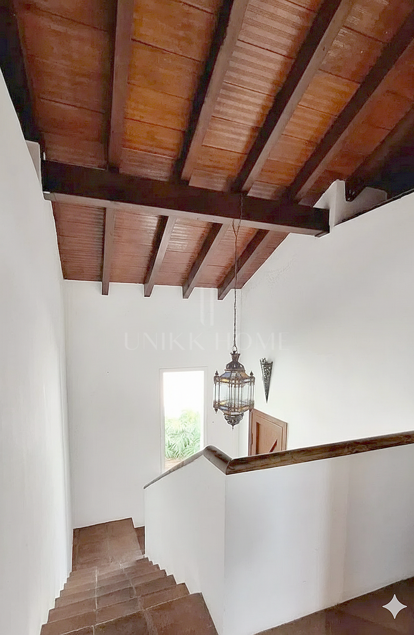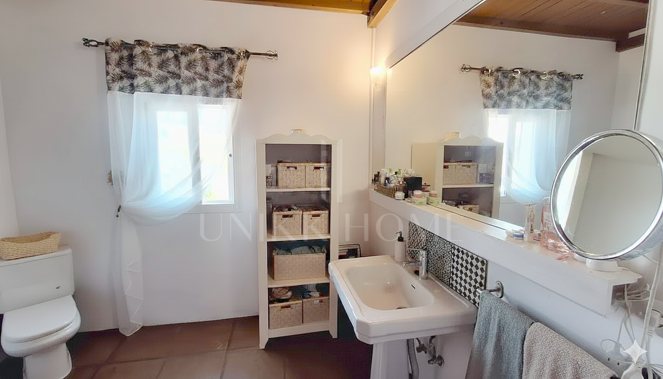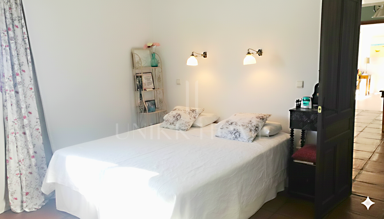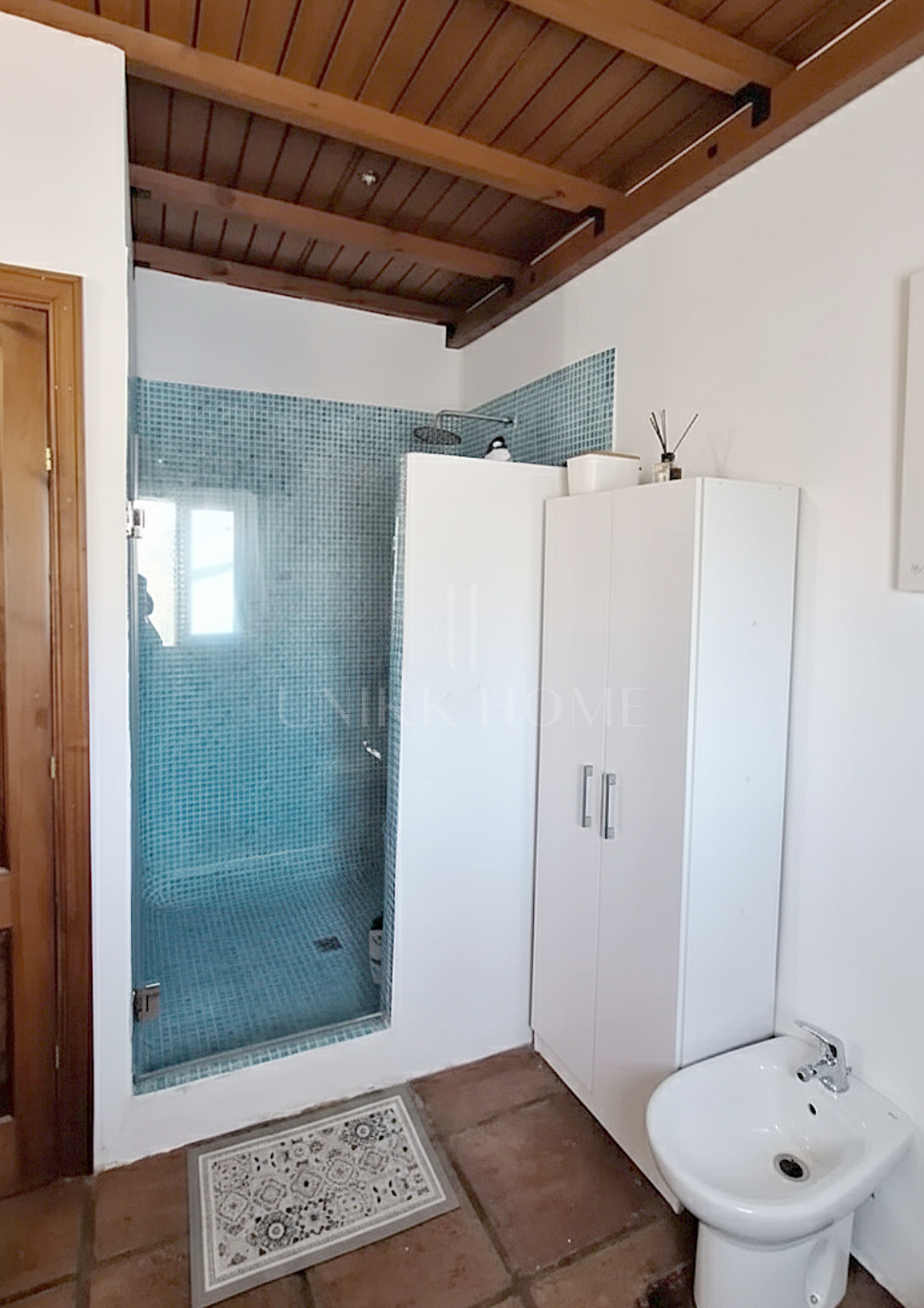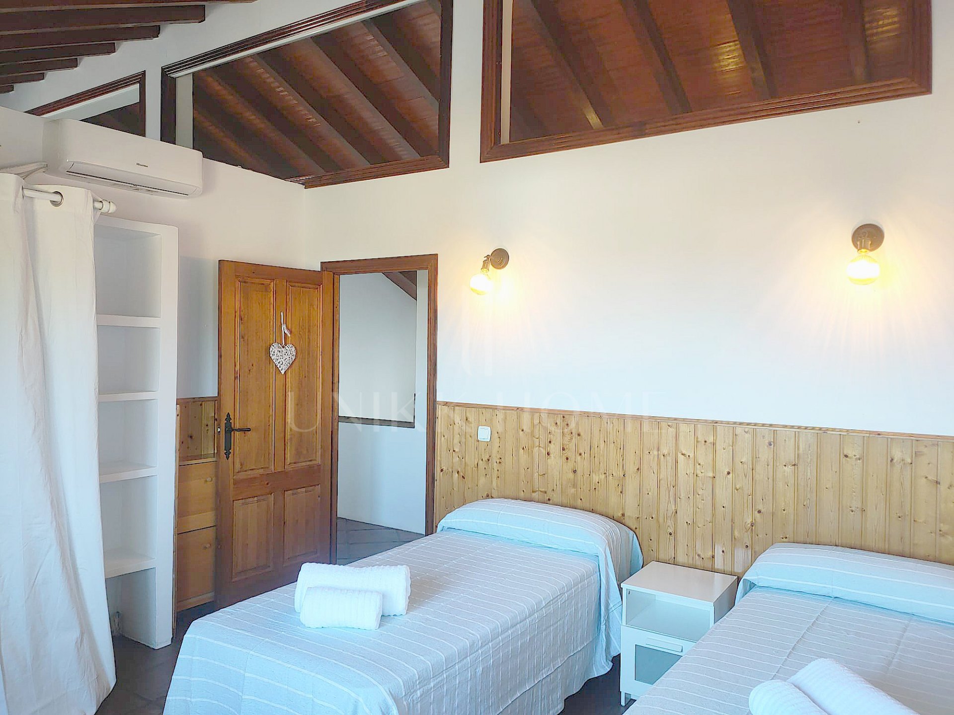 Primera planta: actualmente adaptada como un apartamento independiente, perfecto para alojar a familiares o invitados con privacidad. Dispone de dos dormitorios, un vestidor convertido en una pequeña cocina, un baño completo y una gran terraza de más de 60 m² con fantásticas vistas al mar, al jardín y a la zona de la piscina.