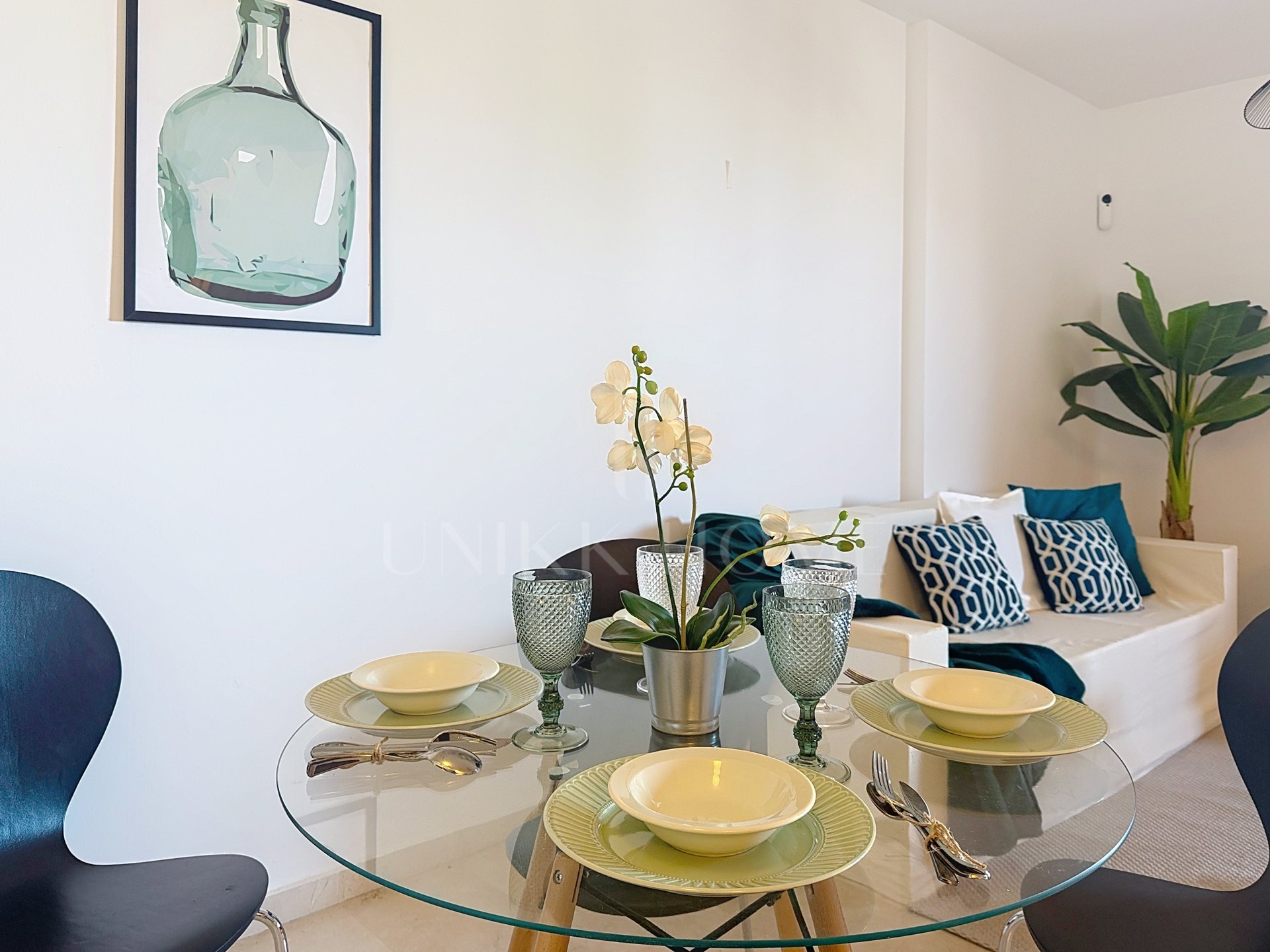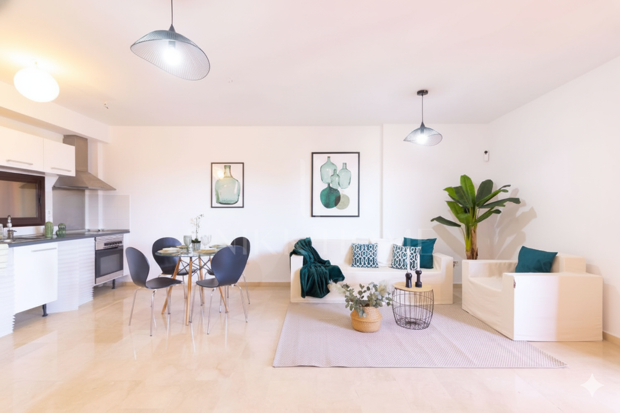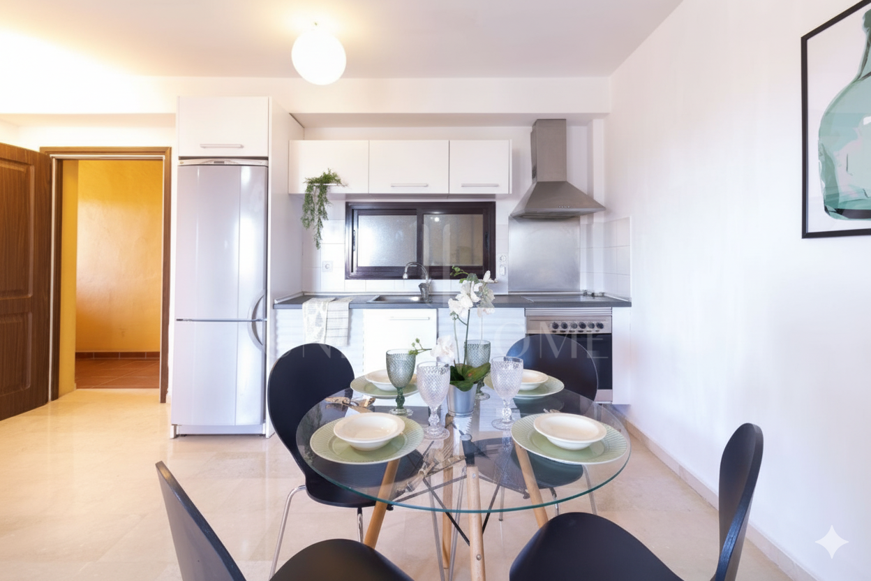 La vivienda dispone de un amplio salón principal, ideal para reuniones familiares o momentos de descanso, con acceso directo a una terraza cubierta que permite disfrutar del clima mediterráneo durante todo el año y desde donde se pueden apreciar vistas parciales al mar y a la ciudad.. La cocina reformado, de concepto abierto, está integrada en el espacio principal, favoreciendo la funcionalidad y la comunicación entre las estancias.